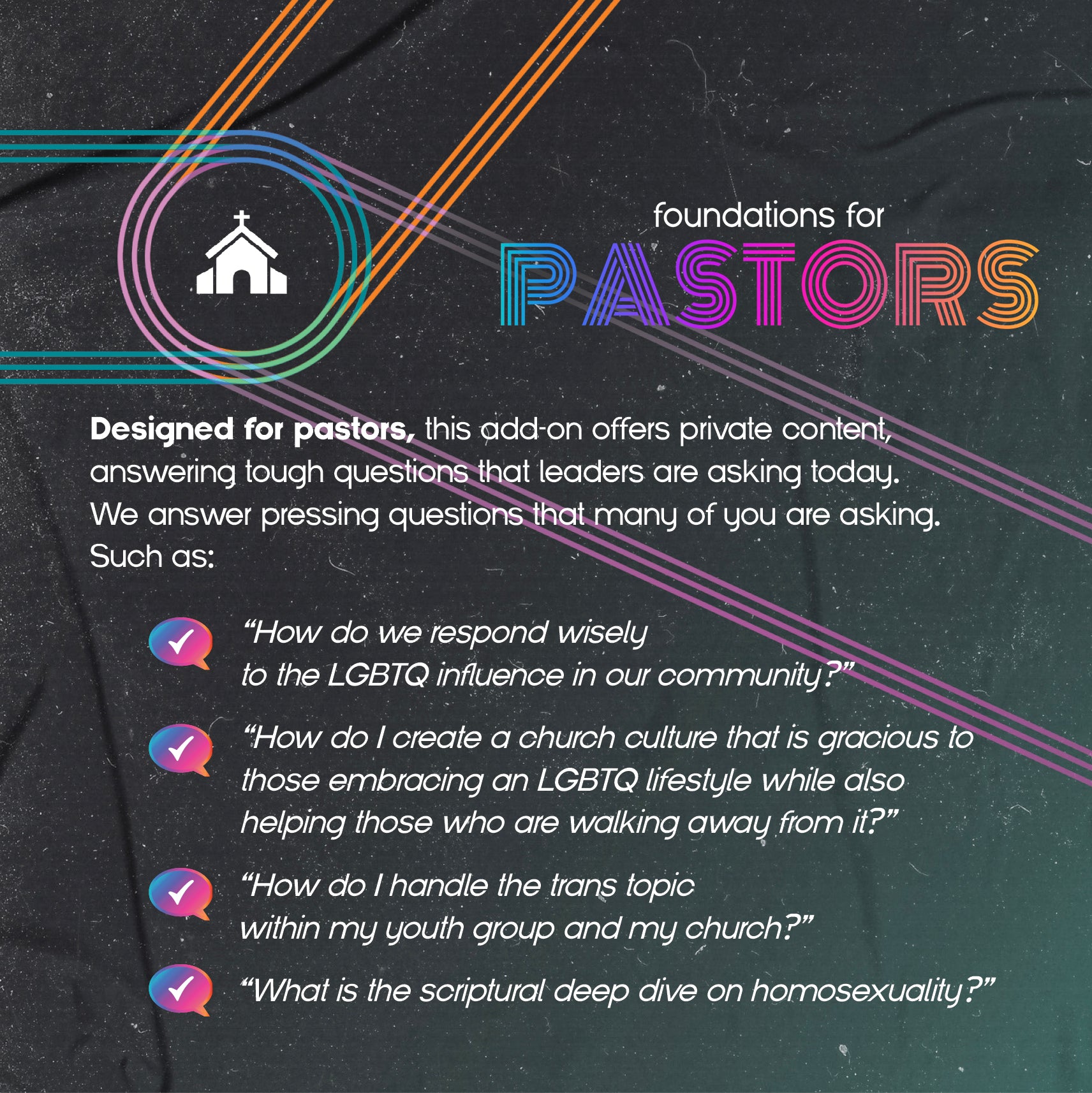 Navigating LGBTQ for Pastors is an expansion of the Navigating LGBTQ series specifically designed to help you equip your whole church. This product grants you license to offer the base Navigating LGBTQ 5-week course to your whole congregation. We provide the videos and the worksheets—you only need to provide the facility and a facilitator.
